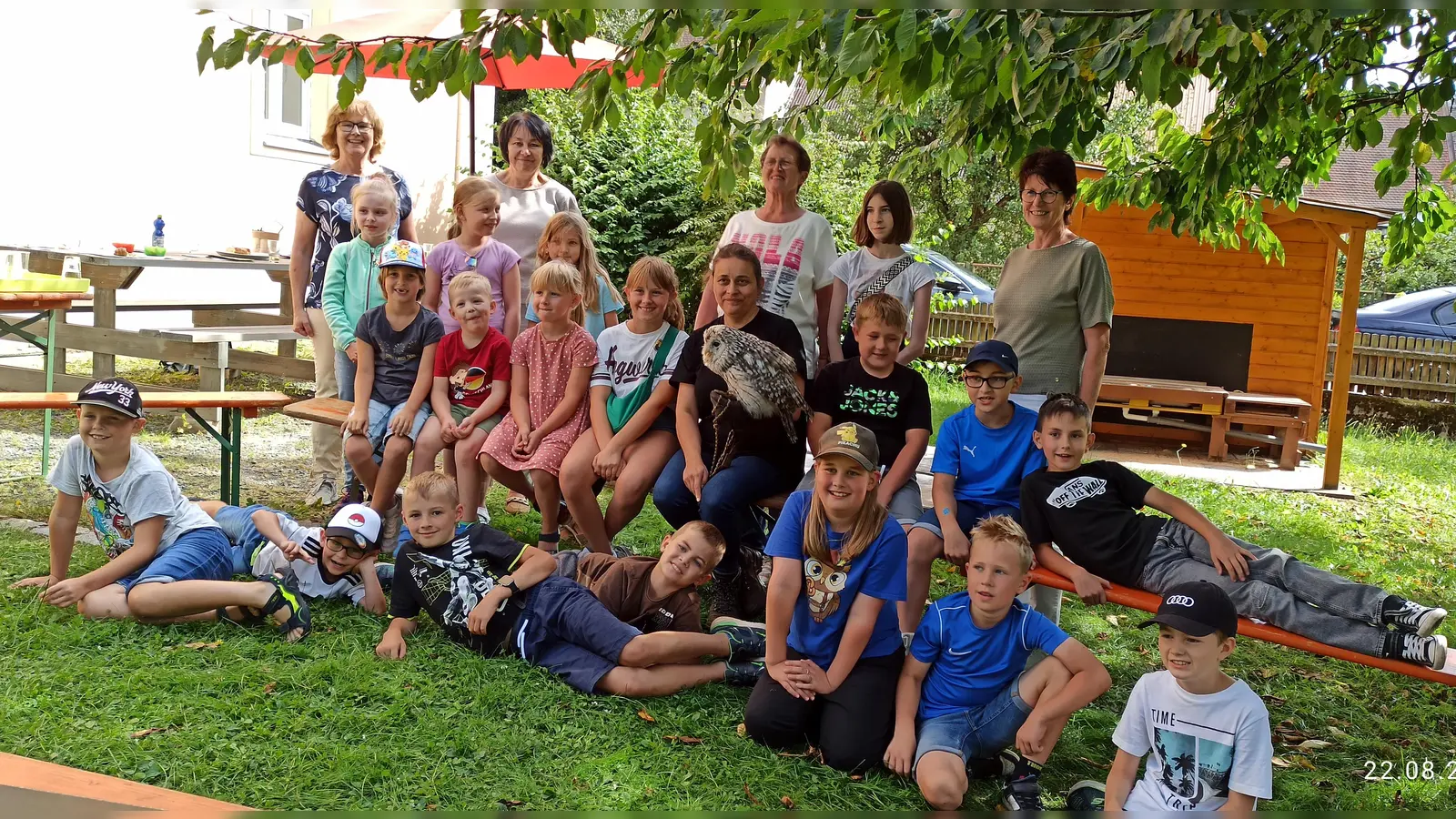 Beim Ferienprogramm des Frauenbunds Kemnath wollten 25 Kinder den Habichtskauz „Birke“ näher kennenlernen. Die Eule wurde von der Falknerin Michaela Domeyer in den Pfarrgarten getragen. Sie erklärte uns, dass der Habichtskauz derzeit im Steinwald wieder angesiedelt wird. Er wird bis zu 60 cm groß, bei einer Flügelspannweite von 1,25 m. Damit wir uns das besser vorstellen konnten, hatte Frau Domeyer verschiedene Flügel von anderen Vögeln mitgebracht. Sie alle stammten von Greifvögeln, die bei Unfällen verunglückt sind. Ganz spannend war es, das Eulengewölle näher zu betrachten. Die Kinder hatten keine Scheu und suchten darin interessiert nach winzig kleinen Knochen und Federn, die von der Nahrung der Eule stammten. Die Falknerin erklärte noch, zu welcher Tageszeit Habichtskäuze jagen, wo sie ihre Jungen aufziehen, wie ihr Gefieder aussieht und noch vieles mehr. Nach all diesen Erläuterungen waren die Kinder bestens für das folgende Quiz gerüstet. Dabei stellte sich heraus, dass sich alle zu wahren Experten entwickelt hatten. Alle wussten beispielsweise genau, dass Habichtskäuze in alten, hohlen Bäumen ihre Jungen aufziehen, dass sie keine Tannenzapfen mögen und noch einiges mehr. Das Eis und die kleine Brotzeit hatten sich alle redlich verdient. So ging ein interessanter und erlebnisreicher Nachmittag zu Ende.