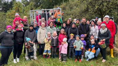 Viele große und kleine Helfer fanden sich kürzlich zur gemeinsamen Apfelernte ein. Mit Säcken, Körben und von zwei Teleskopladern unterstützt, machten sich die Eltern und Kinder an die Arbeit, um die leckeren Früchte einzusammeln. Eine besondere Unterstützung erhielten sie von Dr. Gilch, der großzügig von seiner eigenen Obstplantage die Äpfel spendete. Dank dieser Spende konnte eine besonders große Menge an frischen Früchten zusammengetragen werden, aus denen im Anschluss leckerer Apfelsaft gepresst wurde. Der Kindergarten bedankt sich herzlich bei allen Helfern und Helferinnen, sowie bei Dr. Gilch für seine großzügige Spende.