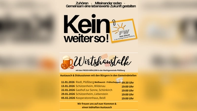 Die FREIEN WÄHLER der Marktgemeinde Plößberg laden alle interessierten Bürgerinnen und Bürger herzlich zu einem „Wirtshaustalk“ ein. Unter dem Motto „Kein weiter so!“ möchten sie mit der Bevölkerung ins Gespräch kommen, Meinungen anhören und aktuelle Themen der Gemeinde diskutieren.