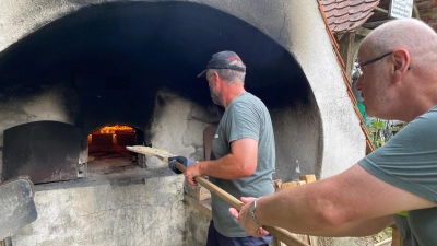 Ein ganzer Hof feiert – und alle Generation, Nachbarn, Freunde sind dabei. Mit knusprigen Brotkuchen, selbst gemachter Pizza und rotem Radi. Als 1994 der Onkel der jetzigen OGV-Fürnried-Vorsitzenden Kerstin Bodendörfer im romantisch gelegenen Tannlohe das erste Backofenfest veranstaltete, sollte eigentlich „nur” das 75jährige Jubiläum des Gartenbauvereins ordentlich gefeiert werden. Und jetzt feiert das Backofenfest selbst einen runden Geburtstag. Der provisorische Parkplatz auf der Wiese dehnt sich ins hohe Gras aus – die Tische sind voll besetzt und die „Jungen” schenken aus, belegen die Brotkuchen und teilen sie aus. Einschließen am Backofen braucht viel Fingerspitzengefühl – und das Ergebnis schmeckt wunderbar! 233 Brotkuchen und Pizzas wurde gebacken (mit einmal Nachschüren in der Halbzeit). Für diese gab es „Platzkarten”! Mehr geht nicht.