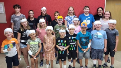Das Jugendrotkreuz erklärt das Ferienprogramm zur „Helden-Zone“. Der „HELD“ steht in der Ersten Hilfe für Hilfe rufen / Notruf, Ermutigen / Trösten, Lebenswichtige Funktionen kontrollieren und Decke unterlegen / zudecken. Dies uns vieles mehr hat die JRK-Gruppenleiterin Monika Stahl zusammen mit vier Jugendrotkreuzlern den 15 Teilnehmern in zwei Stunden mit einer dicken Portion Spaß ermittelt. Neben dem „HELD“ haben die Kinder auch gelernt, warum man Verbände anlegt: Damit kein Schmutz in die Wunde kommt und die Blutung gestoppt wird. Natürlich wurde dies auch fleißig geübt, ob am Fuß oder Kopf. Bevor der Notfallkrankenwagen ganz genau unter die Lupe genommen wurde, wurde besprochen, was zu tun ist, wenn jemand bewusstlos ist und die stabile Seitenlage geübt. Monika Stahl dankt abschließend Amon Mutzbauer, Barbara Kastner, Fabian Gebhard und Kornelius Hackl, sowie dem stellvertretender Bereitschaftsleiter Philipp Hundhammer, der den Krankenwagen erklärte, für ihre tatkräftige Unterstützung. Der lehrreiche und zugleich spaßige Nachmittag bereitete allen Teilnehmern sichtlich Freude.
