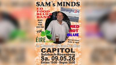 Ehemalige Bandkollegen und Freunde des verstorbenen Amberger Musikers Hermann „Sam“ Stadler veranstalten ein Gedenkkonzert zu seinen Ehren. Unter dem Namen „Sams Minds“ bringen sie die Musik wieder auf die Bühne, die sie mit ihm verbunden hat. Stadler prägte über Jahrzehnte die Amberger Musiklandschaft und brachte viele Musiker in immer neuen Formationen zusammen. Das Programm des Abends umfasst Stücke aus verschiedenen Bands und Projekten, in denen er aktiv war. Dazu gehören Red Hot Blue, Ed Food Blues Band, Straight2H, 7 Minds Together, Éire Music und Special Gue$t. Die musikalische Bandbreite reicht dabei von Blues über Rock bis hin zu Irish Folk. Das Konzert findet am Samstag, 9. Mai, im Capitol in Sulzbach-Rosenberg statt.