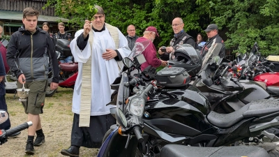 „Gott schick deine Engel aus, egal wo ich bin – beschütze mich.“ Diesen Psalm aus dem Alten Testament haben Menschen seit Tausenden Jahren gebetet, erklärte Pfarrer Oliver Pollinger. „Und auch wir bitten heute: Bleib bei uns, geh unseren Weg mit uns, wenn wir aufs Motorrad steigen.“ Der Motorradclub Altendorf, bei dem der Pfarrer selbst Mitglied ist, hatte am Samstag, 3. Mai, zu einer Fahrzeugsegnung in den Schützengarten in Altendorf eingeladen. „Es gibt immer wieder Unfälle“, so Pollinger, manchmal schlimme, manchmal kleinere. Deshalb wolle man gemeinsam Gott um Schutz bitten. Pollinger hoffte, dass alle im Verkehr rücksichtsvoll, hilfsbereit und sicher unterwegs sind. Im Anschluss an die Andacht weihte er alle Fahrzeuge und verteilte Christophorus-Plaketten und kleine Kreuze. Wenn auch das Wetter nicht ganz optimal war und gerade zur Andacht ein kleiner Schauer über Altendorf zog, kamen viele Gäste – ob Privatpersonen oder Mitglieder von Motorradvereinen aus der Umgebung. Roller, Mopeds, Motorräder, Oldtimer – alle möglichen Gefährte säumten den Schützengarten. Im Anschluss an die Segnung luden die Mitglieder des Motorradclubs ihre Gäste in den Schützengarten zu Gegrilltem und Getränken, Kaffee und Kuchen – gerüstet mit Pavillons machte da auch der Regen, der ohnehin bald aufklarte, nichts. Seit über 40 Jahren gibt es den Motorradclub (MC) Altendorf. Eine Fahrzeugweihe hielt der Verein heuer erstmals seit über zehn Jahren wieder.