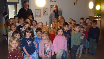 Auch in diesem Jahr bereiteten die Schnitzer des Oberpfälzer Waldvereins (OWV) Waldthurn den Kindern in der Kindertagesstätte St. Josef eine vorweihnachtliche Überraschung. Nachdem es im vergangenen Jahr eine Krippe, bestehend aus einem großen Stall mit vielen Figuren, und viele Wassertiere gab, haben sich die Hobbykünstler in diesem Jahr nach reiflicher Überlegung für drei „Heilige Familien“ (bestehend aus Josef, Maria und dem Jesuskind in der Krippe) entschieden. Die Figuren sind größer und stabiler gestaltet und damit gut für kleine Kinderhände auch zum Spielen geeignet. „Schnitzerchef“ Erwin Klotz und Josef Pflaum senior brachten am vergangenen Donnerstagvormittag die Kunstwerke in die Einrichtung. Die Erzieherinnen Karolina Nemcova, Sabine Zetzl und Tanja Pflaum begrüßten mit den Vorschulkindern und den Kindern aus der Gelben Gruppe die beiden Hobbykünstler. Mit einem Adventslied und einem kleinen Gedicht bedankten sie sich für die Geschenke. Jeweils eine heilige Familie „wohnt“ jetzt in jeder Krippengruppe, eine Heilige Familie ziert den Eingangsbereich. Als zusätzliches „Zuckerl“ hat Erwin Klotz noch einige wunderschön gestaltete Holzsterne mitgebracht.