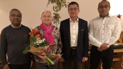 Nach einem beeindruckenden Rorate-Gottesdienst – zelebriert von „Geburtstagskind“ Pater Jimmy Joseph – in der nur mit Teelichtern und Kerzen erleuchteten Pfarrkirche lud die Kirchenverwaltung Schlicht alle haupt- und ehrenamtlichen Mitarbeiter der Pfarrgemeinde zu einem Dankeschön-Essen in den Gasthof Roter Hahn ein. Pfarrer Hruday Madanu begrüßte diese im voll besetzten Saal und sah es nicht nur als Aufgabe, sondern als eine Ehre an, sich auch im Namen der Pfarrei bei ihnen für ihre Tätigkeit in der Pfarrei zu bedanken. Damit trügen diese ganz wesentlich dazu bei, die Pfarrgemeinde lebendig zu erhalten. Er brachte seine Freude über die gute Zusammenarbeit zum Ausdruck, die für ihn immer wieder spürbar sei, und er dankte auch für das Vertrauen, das den Seelsorgern entgegengebracht werde. „Eine lebendige Kirche wäre ohne Ehrenamt einfach nicht möglich!“ sagte er. „Nur dort wo wir gemeinsam unseren Weg gehen, einander helfen, einander Mut machen und füreinander da sind, wird die lebendige Kirche sichtbar, ja spürbar.“ Mit dem Wunsch für eine besinnliche Adventszeit, frohe und gesegnete Weihnachten und ein gesundes und friedvolles neues Jahr 2026 schloss er. Dem schloss sich auch Kirchenpfleger Markus Graf an, der ebenfalls die Bedeutung des ehrenamtlichen Engagements für das Leben in der Pfarrei hervorhob. „Mit großem Einsatz bereichert und gestaltet ihr unsere Kirche, indem ihr all euer Wissen, eure Freizeit und viel Herzblut einbringt.“ Dafür solle das Danke-Essen ein Zeichen der Wertschätzung sein. Dann rief er, sehr zu ihrer Überraschung, Agnes Heldmann nach vorn und fragte in die Runde, was diese mit Richard von Weizsäcker zu tun habe. Beide haben 1984 ihre Aufgabe übernommen, er als Bundespräsident, sie das Reinigen der Kirchenwäsche in Schlicht. Aber im Gegensatz zu Weizsäcker, der sein Amt nach 10 Jahren abgegeben habe, habe Agnes Heldmann ihre Aufgabe 41 Jahre lang vorbildlich und zuverlässig ausgeführt. Dafür sagte er ihr im Namen der Pfarrei mit Blumen und einem Geschenk Dank. Und er freute sich, dass mit Jutta Kraus und Edeltraud Schwabe auch Nachfolgerinnen gefunden werden konnten. Das vom Gasthaus hervorragend zubereitete Büfett, ein von Pfarrsekretärin Manuela Kreuzer vorbereitetes Geschenk und angeregte Gespräche rundeten den gelungenen Abend ab.