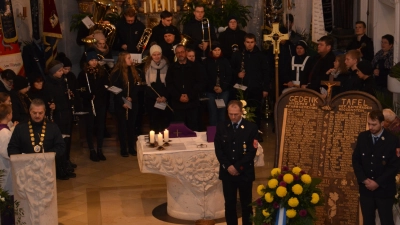 Die Botschaft, die der Volkstrauertag den Menschen in der Großgemeinde Vohenstrauß mit auf den Weg gab, war unmissverständlich: Gemeinsam für den Frieden. Bürgermeister Andreas Wutzlhofer stellte diese Worte auch in der Pfarrkirche St. Erhard in den Mittelpunkt seiner Rede am aufgebauten Ehrenmal am Altar. Wegen des starken Regens wurde die Feier mit der Jugendkapelle Roggenstein unter Leitung von Josef Wolfrath im Ortsteil nicht im Freien am Mahnmal abgehalten. Der Volkstrauertag 2023 stehe nicht nur unter dem historischen Eindruck des Ausbruchs der beiden Weltkriege.