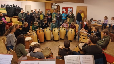 Viel Rhythmus, Action und Bewegung war am Buß- und Bettag beim Jungbläserworkshop des Kohlberger Posaunenchors angesagt. Während nur eines einzigen Tages gelang es den jungen Musikern sowohl mit ihren gewohnten Instrumenten, als auch mit neuen Rhythmusinstrumenten verschiedene Stücke einzuüben, diese miteinander zu verbinden und abschließend schwungvoll zu präsentieren. Fünfzehn Kinder und Jugendliche zwischen acht und fünfzehn Jahren hatten während ihres schulfreien Tages Lust gemeinsam Musik zu machen und dabei etwas Neues auszuprobieren. Darum hatten die Verantwortlichen des Chores für diesen Tag Tina Eff vom Bezirksjugendring Oberpfalz als Referentin eingeladen, die gleich mit einem ganzen Bus voller Perkussionsinstrumente anreiste. Gemeinsam mit der Jugendbeauftragen des Kohlberger Posaunenchores und der Leiterin der Jungbläsergruppe Erika Piehler gestaltete sie einen abwechslungsreichen und intensiven Probentag, bei dem der Spaß und das Gemeinschaftserlebnis natürlich auch nicht zu kurz kamen. Im Laufe des Workshops erarbeiteten die Kinder verschiedene Rhythmen und fügten sie schnell zu mitreißenden Stücken zusammen, bei denen voller Körpereinsatz und Konzentration gefragt war. Für Stärkung und Verschnaufpausen zwischendurch sorgten weitere Mitglieder des Posaunenchores mit einem leckeren Mittagessen und Kuchen am Nachmittag. Dass alle voll bei der Sache waren und viel Spaß hatten, spürte am Ende des Tages auch alle Zuhörer, die zu einem kleinen Abschlusskonzert eingeladen waren und die jungen Musiker mit begeistertem Beifall belohnten. Die Jungbläser des Posaunenchors Kohlberg bedanken sich ganz herzlich beim Bezirksjugendring Oberpfalz, der mit seinem Jugendkulturservice „Bunt gefächert” eine vielfältige Auswahl an Fachreferenten für jugendkulturelle Angebote von Hiphop bis Jonglage bietet und damit Kinder- und Jugendarbeit vor Ort in den Gemeinden fördert, für die Ermöglichung dieses rundum gelungenen Workshops