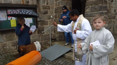 Trotz ungünstiger Witterung ließ es sich die Ziege mit Kosenamen Blümchen nicht nehmen, den weiten Weg von Neuhaag zur St. Michaelskirche nach Brand zu gehen, um den Segen im Rahmen der Tiersegnung zu bekommen. Auch kräftiges Hundegebell störte sie nicht. Pater John segnete die einzelnen Tiere und ermahnte die Anwesenden, im Sinne von dem Tierheiligen Franz von Assisi mit den Geschöpfen verantwortungsvoll umzugehen.