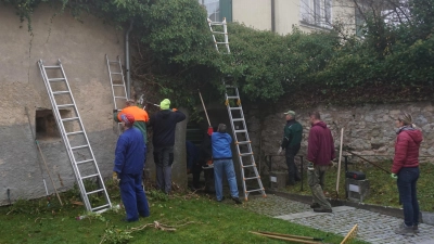 Am Samstagvormittag, den 25. Oktober 2024 trafen sich viele ehrenamtliche Helfer und Helferinnen mit Werkzeugen bepackt an der Simultankirche St. Laurentius in Kürmreuth. Es ging dem Efeu an den Kragen. Seit Jahrzehnten umrankt dieser idyllisch die ehemalige Schlossmauer und den Torbogen zur Kirche. Mittlerweile klettert er auf nebenliegende Dächer oder bildet mächtige Ausläufer, welche die Stabilität der Mauer stark gefährdet. Im Sommer fand eine Begehung mit dem Landratsamt und den beiden Pfarrern Ahnert und Zeltsperger und Mitgliedern der Kirchenvorständen statt. Hier wurden die notwendigen Maßnahmen, wie die vollständige Entfernung und starker Rückschnitt im Herbst besprochen. Der ehemalige Kirchenvorsteher und Anlieger, Rudi Hagerer übernahm die Koordination und Vorbereitung der Arbeiten. So kappte er bereits im Sommer Hauptstämme und kontrollierte, ob noch Vögel oder Insekten Schutz suchen. Mit Traktoren, Kipper, Leitern, Motorsägen, Hochentaster und viel Muskelschmalz rückten katholische und evangelische Ehrenamtliche dem Efeu zu Leibe. „Eine tolle ökumenische Aktion, so lebt Kirche in der Praxis” lobte Pfarrer Ahnert die vielen Helfer bei einem Besuch vor Ort. Mit dem 12 Uhr Läuten der St. Laurentiuskirche wurden die Arbeiten beendet. Bei einer zünftigen Brotzeit im Schloßhof begutachteten alle zufrieden das gemeinsame Werk. An dieser Stelle ein herzliches Vergelt's Gott an alle tatkräftigen Helfer, die mit Werkzeug, Sprit und Muskelkraft dem Efeu zu Leibe gerückt sind. Vor allem ein Dankeschön an Rudi Hagerer als Hauptorganisator. Es ist geplant, künftig den Efeu jährlich einzudämmen, damit er nicht alles überwuchert und große Schäden an der historischen Mauer anrichtet.