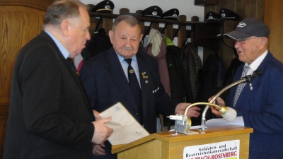 Im Gasthaus „Zum Bartl” begrüßte der 1. Vorsitzende Franz Schneller, der sich nicht mehr zur Wahl für dieses Amt stellt, die Kameraden und Kameradinnen, den Jubilar, sowie den 1. Bürgermeister Stefan Frank mit Gattin und den BSB-Bezirksvorsitzenden Horst Embacher. Nach dem Totengedenken und der Genehmigung der Tagesordnung begrüßte 1. Bürgermeister Frank die Anwesenden und bedankte sich für die bisherige Arbeit, und beim scheidenden 1. Vorsitzenden Franz Schneller, der über 25 Jahre den Verein geleitet hat. Er betonte, dass sich die Kameradschaft einsetzt für die Pflege des Soldatenfriedhofes, die Kriegsgräbersammlung (Ergebnis 1.985,25 €) durchführt und sich am Volkstrauertag beteiligt. Er hofft und wünscht, dass die Kameradschaft weiterhin so lebendig bleibt. BSB-Bezirksvorsitzender Horst Embacher dankte in seinem Grußwort seinem Ziehvater Franz Schneller für die lange Zeit als Vorsitzender und auch als Weggefährte im ehemaligen Kreisverband. Dem Jubilar, Heiner Koch, wurde von Schneller und Embacher das Veteranenabzeichen der Bundeswehr überreicht. Er trat am 04.04.1960 in Weiden in die Bundeswehr ein und wurde nach einer freiwilligen Zeit am 31.12.1961 ehrenhaft entlassen. Im ausführlichen Rechenschaftsbericht wurden z.B. die Teilnahme an Vorstandssitzungen, Kreis- Bezirks- und Landesversammlungen, Schießabende, die Besichtigung einer Kleinstbrauerei, der BW-Wetterstation in Kümmersbruck, Hahnenkammfest in Edelsfeld, die Adventsfeier und einiges mehr aufgelistet. Schneller besuchte erkrankte Kameraden und überbrachte die besten Grüße des Vereins bei runden Geburtstagen. Die Mitgliederzahl wurde mit 31, darunter 3 Frauen, angegeben. Er dankte der Stadt für die Unterstützung und dem Bezirksvorsitzenden für die gute Zusammenarbeit. Kassier Alfred Promm gab einen übersichtlichen Kassenbericht ab. Es wurde gut gewirtschaftet. Hans Graf und Reinhold Dütsch bescheinigten in ihrem Revisionsbericht eine gut und sauber geführte Kasse und beantragten die Entlastung der Vorstandschaft, die einstimmig genehmigt wurde. Die anstehenden Wahlen brachten folgendes Ergebnis: 1. Vors. Kurt Falk, 2. Vors. und Schriftführer Franz Schneller, Kassier Alfred Promm, Fahnenträger Otto Gareis, Schusswart Helmut Pilhofer, Schießwart Günter Fleischmann, Kassenprüfer Hans Graf und Reinhold Dütsch, Beisitzer Gerd Meier, Werner Zeltner und neu Hans-Jürgen Falk und Roland Kohl. Der Bezirksvorsitzende sprach kurz über die Situation der Bundeswehr, die Erhöhung des Landesbeitrags und gab einige Termine bekannt. Der neue 1. Vorsitzende Kurt Falk bedankte sich für das Vertrauen, bedankte sich bei den Ehrengästen und schloss mit dem Gruß „In Treue fest” die Jahresversammlung.