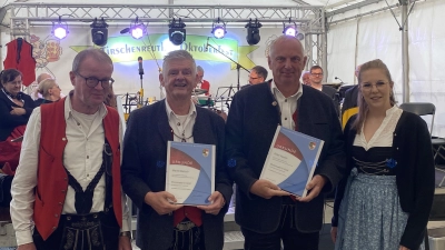 Ein besonderer Moment prägte das Oktoberfest des Fördervereins Fischhofpark am Sonntag, den 14. September 2025: Der Nordbayerische Musikbund nutzte das stimmungsvolle Fest, um zwei langjährige Mitglieder der Stadtkapelle Tirschenreuth zu ehren. Zunächst wurde Peter Hamm für 50 Jahre aktives Musizieren ausgezeichnet. Seit einem halben Jahrhundert trägt er mit seinem Engagement und seiner Zuverlässigkeit entscheidend zum kulturellen Leben der Stadt bei. Auch Dirigent Martin Bartsch wurde gewürdigt: Er erhielt die goldene Nadel für beeindruckende 60 Jahre aktives Musikerdasein. Bartsch steht zudem seit über vier Jahrzehnten als Stadtkapellmeister am Dirigentenpult und wurde erst im vergangenen Jahr von Bürgermeister Franz Stahl für sein 40-jähriges Jubiläum in dieser Funktion ausgezeichnet. Mit seinem unermüdlichen Einsatz hat er die Stadtkapelle maßgeblich geprägt und über Generationen hinweg weiterentwickelt. Die Ehrungen nahm Laura Dietl, Kreisdirigentin des Nordbayerischen Musikbundes, vor: „Die Auszeichnungen sind ein Dankeschön für viele Jahre ehrenamtliches Engagement und musikalische Qualität.” Beide Musiker erhielten neben der Goldnadel eine Urkunde als Anerkennung ihrer Verdienste um die Blasmusik.